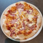 Sauce tomate, moza, jambon cuit, oeuf, crème fraiche, origan