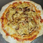 Sauce tomate, moza, poulet curry, oignons, poivrons, origan