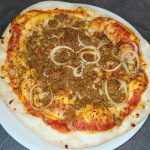 Sauce tomate, moza, boeuf épicé, oignons, origan