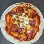 Sauce tomate, moza, crème fraiche, coppa, merguez, chorizo, origan